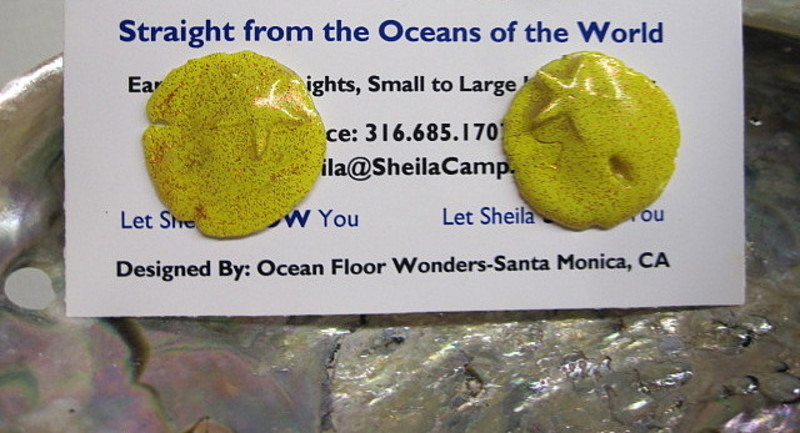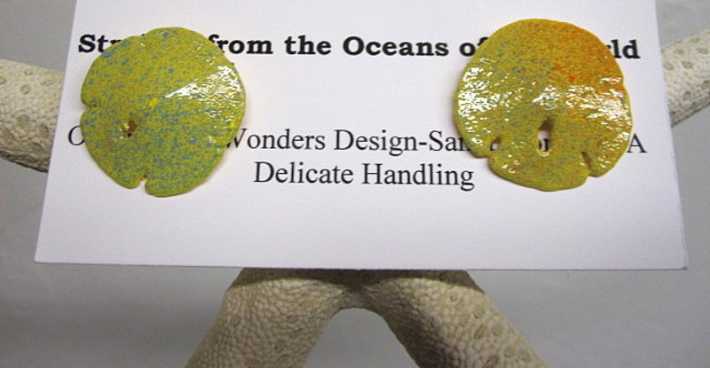 Earrings are 3/4". Yellow Painted with Glitter and Baby Starfish. Click image to enlarge.