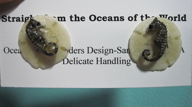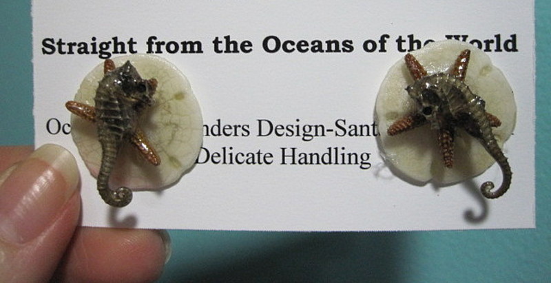 Earrings are 1". Natural with Rare Sea Horses On Top of Baby Star Fish. Click image to enlarge.