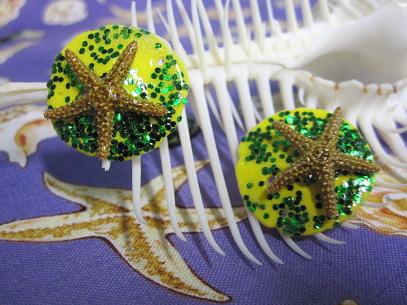 Earrings are 1". Yellow Painted with Green Santa Monica Glitter and Brown Star Fish.