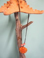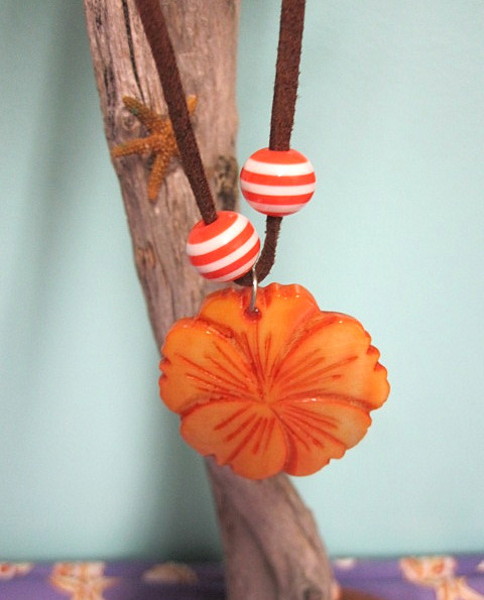 Necklace is 9" and leather with a closed hook clasp. Orange shell is 1 1/2". Click large image to enlarge. Click small image. Move cursor to large image. Click again.