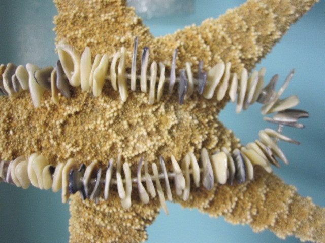 Necklace is 8" with beige and gray shells with a screw together clasp. Click large image to enlarge. Click small image. Move cursor to large image. Click again.