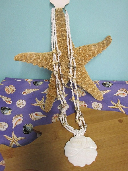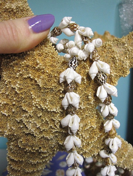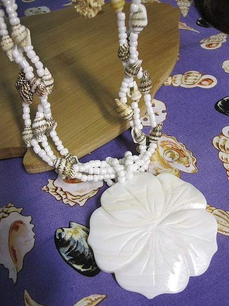 Necklace is 11 1/2" and flower shell is 2 1/2 with a closed hook clasp. Click large image to enlarge. Click small image. Move cursor to large image. Click again.