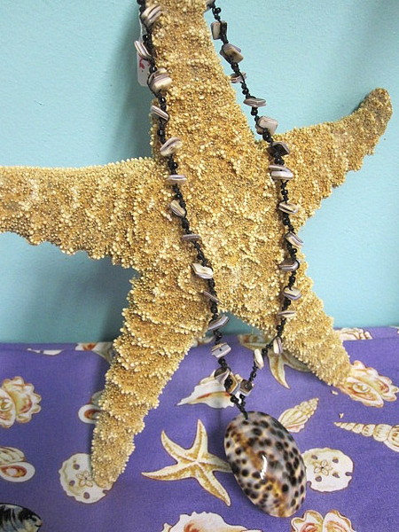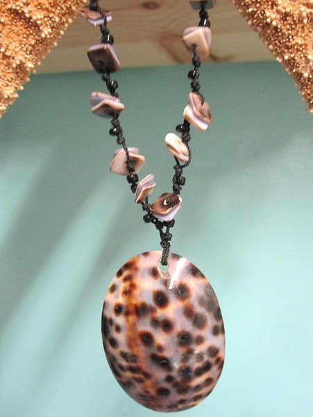 Necklace is 9" with black line of tiny shells and black beads. Spotted shell is 2". Clasp is a loop over bead. Click large image to enlarge. Click small image. Move cursor to large image. Click again.