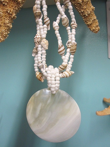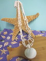 Necklace is 12" with tiny shells and round shell is 2 1/4" with a closed hook clasp. Click large image to enlarge. Click small image. Move cursor to large image. Click again.